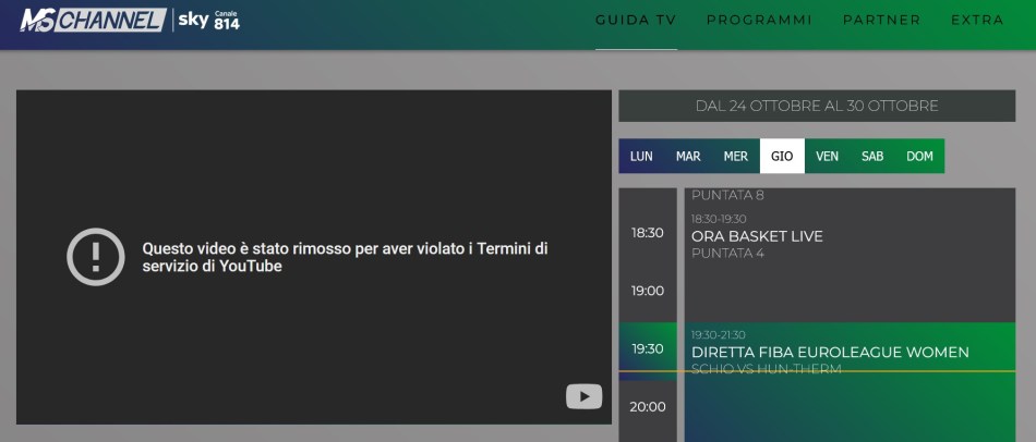 Per l’Eurolega femminile appena ripartita nel frattempo, rimane la diretta su Youtube (senza commento, tranne la game of the week scelta, con telecronaca in inglese). Da quest’anno però le gare delle italiane, Schio e Bologna, vengono trasmesse in diretta anche su MS Channel, ma solo sul canale 814 del pacchetto SKY: sul sito per vederle in streaming il video ieri è stato rimosso per violazione dei termini…